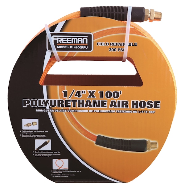 The Freeman P14100RPU 1/4" x 100' Polyurethane Air Hose with Field Repairable Ends is an excellent pneumatic hose for DIYers at home as well as construction contractors at the job site. The light weight of polyurethane hose makes it ideal for applications where dragging a heavy hose is an issue, like roofing. The smooth, non-marring finish makes it ideal for indoor trim work where scratching surfaces could create damage. The 1/4" x 100' Polyurethane Air Hose has field repairable end fittings for time saving repairs, and also maintains very good cold weather flexibility.