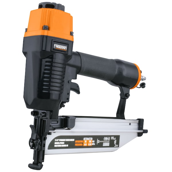 The Freeman PFN64 Pneumatic 16-Gauge 2-1/2" Straight Finish Nailer is ideal for applications such as base moulding, crown moulding, furniture construction, chair rails, door and window casing, and cabinetry. This air powered nail gun is compatible with 16 gauge straight finish nails from 1" to 2-1/2", and contains a quick release nose for fast and easy access clearing in the event of jammed fasteners. Other convenient features include a tool-free finger depth adjust for various applications, and a no mar safety contact to prevent damage to your surface during finish work. The magazine and cylinder of this nailer are constructed of anodized aluminum for lightweight durability, and the Teflon O-rings and one piece drive blade also work to extend the life of the tool. The ergonomically designed die cast aluminum body results in a lightweight and rugged tool great for use over long shifts, and the comfort grip handle reduces fatigue while increasing control and accuracy. This nail gun will allow you to tackle finish work quickly and easily whether you are a DIYer working on home improvement and repair projects or a professional contractor at the job site. The Pneumatic 16-Gauge 2-1/2" Straight Finish Nailer includes a belt hook, safety goggles, air tool oil, and adjustment tools