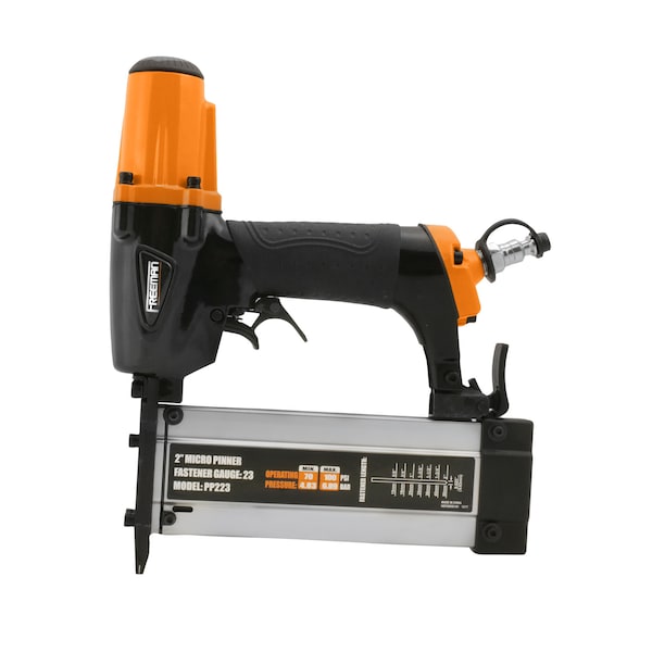The Freeman PP223 Pneumatic 23-Gauge 2" Micro Pinner with Case is as powerful and versatile as it is lightweight, making it ideal for DIY home improvement and repair projects as well as professional construction jobs. Applications such as fastening detailed trim, cabinetry trim, muntin bars, moulding, picture frames, and hobbies and crafts are perfect to tackle with this headless pin nailer. This air powered nail gun is exceptionally easy to load, and is compatible with 23 gauge headless micro pin nails from 5/8" to 2". A no-mar tip allows nails to be put in tight spaces without leaving a mark on delicate trim. The magazine of this pneumatic nail gun is composed of anodized aluminum for lightweight durability, and the ergonomic body and comfort grip handle are made for ease of use over extended periods of time. This micro pinner comes equipped with a 360 degree adjustable exhaust to direct air away from your face, as well as a dual safety trigger to prevent accidental firing. The Pneumatic 23-Gauge 2" Micro Pinner includes a rugged plastic carry case, belt hook, air tool oil, and adjustment tools