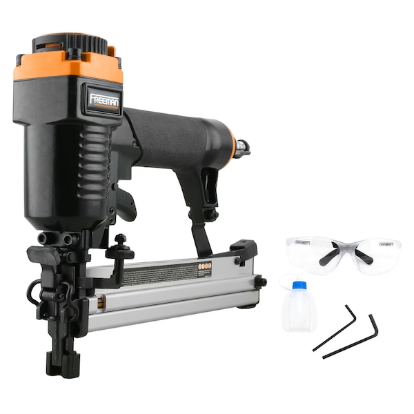 The Freeman PST9032Q Pneumatic 18-Gauge 1-1/4" Narrow Crown Stapler with Quick Jam Release is ideal for DIYers working on home improvement and repair projects as well as professional contractors at the job site. This air powered staple gun is great for finish work such as decorative trim, cabinetry, cabinet backing, and hobbies and crafts. Compatible with 18 gauge 1/4" narrow crown staples from 1/2" to 1-1/4", this lightweight stapler has a no mar safety tip to prevent damaging your work surface. Other convenient and time-saving features include a quick jam release to allow fast access clearing in the event of jammed staples, and a tool-free finger depth adjust wheel near the trigger. A one piece drive blade of hardened steel and an oil-free design result in a low maintenance tool. The ergonomically engineered body makes this rugged pneumatic stapler easy to use for long shifts, and a comfort grip handle reduces fatigue and increases control. The cylinder and magazine are built from anodized aluminum for long lasting durability, and the air filter / anti-dust cap help extend the life of the stapler by keeping the internal components free of debris. A 360 degree adjustable exhaust allows you to direct air away from your face and debris. The Pneumatic 18-Gauge 1-1/4" Narrow Crown Stapler with Quick Jam Release will increase your productivity tremendously, includes a belt hook, safety goggles, air tool oil, and adjustment tools