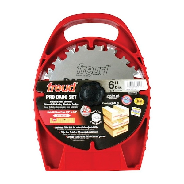 Freud's quality and craftsmanship in a stacked dado set, but at a wobble dado price. The negative hook angles make Flat bottom grooves and virtually splinter-free cuts. It has two outer blades with five two wing Chippers. This makes it ideal for underpowered saws because it requires less power to feed. All blades come with Freud's anti-kickback design.