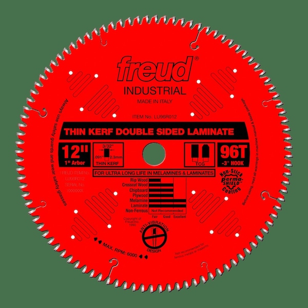 Double-sided laminates, melamine & veneered plywood. Depth of cut (1/4" min to 1-5/8" max)
