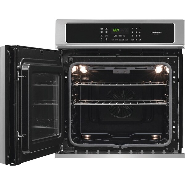The Frigidaire Gallery 27-inch Electric Wall Oven features a third heating element and single convection fan that circulate hot air throughout the oven for faster and more even multi-rack baking. With juust one touch of a button keeps food warm until everything - and everyone - is ready. Easy and flexible reversible side swing door can be installed to open left or right based on your needs. Set your oven to begin cooking on your schedule- it can be programmed from one to 24-hours. And your oven cleans itself - so you donftt have to. Self clean options available in 3 and 4-hour cycles