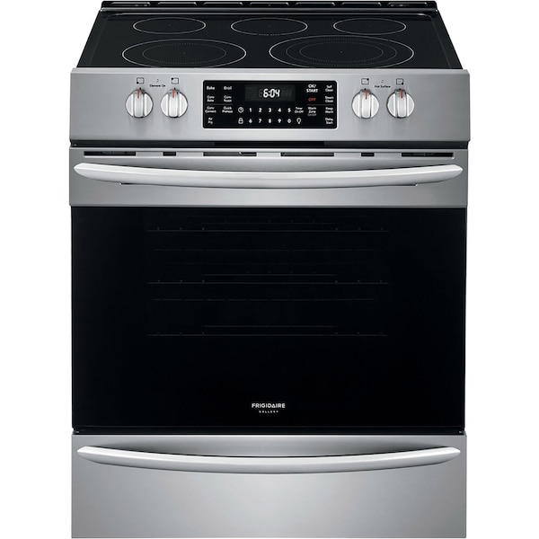 Frigidairefts Gallery30-inch electric range is a free-standing range featuring a wall-to-wall black ceramic cooktop and premium front controls for a built-in look. This range boasts a convenient interior light, 30-minute steam cleaning mode for everyday maintenance and a quick preheat featured aimed at cutting down the wait between turning on your oven and cooking your food. Our electric cook-top features a flexible five burner cooktop that can accommodate small and large pots alike. Cook with Frigidairefts Air Fry technology to cook crispy, healthy and delicious meals with little to no oil. This range features a smudge-proof exterior that withstands fingerprint for an every day beautiful finish. Your new 30-inch Gallery electric range with fit in your existing 30-inch range cutout, or weftll help with professional help - thatfts the Frigidaire Fit Promise
