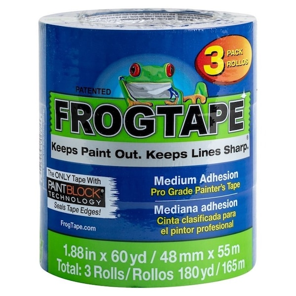 FrogTape pro grade painter's tape combines the sharp paint lines of PaintBlock technology with the value of a traditional blue painter's tape into an exclusive contractor multi-pack. FrogTape pro grade is treated with paintblock technology, which forms a micro-barrier to seal the edges of the tape. This prevents paint bleed and delivers the sharp paint line performance you expect from the FrogTape brand. Featuring a premium adhesive that is recommended for cured painted walls and trim, glass and metal, this blue painter's tape removes cleanly from most surfaces for 14 days. Available only in contractor multi-pack.