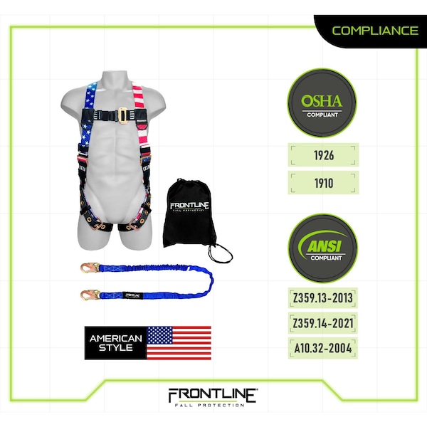 Introducing the Combat Compliance Go-to-Work Kits by Frontline Fall Protection-American-inspired style and ready to use straight out of the bag! Designed with convenience and performance in mind, these kits are the ultimate fall protection essentials, adaptable for a wide range of applications. Frontline's Combat Compliance Kits combine durability, reliability, and rugged American-inspired design, crafted for workers across all industries. The harness and lanyard feature high-tenacity polyester with contrasting colors, making inspections easier and enhancing visibility on the job.