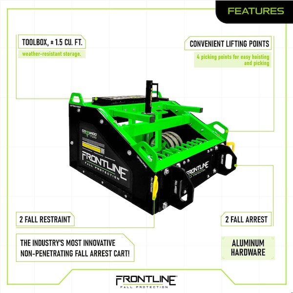 Frontline Introduces the patent pending Commando Tank, the most innovative and revolutionary non-penetrating fall arrest cart in the industry! This OSHA compliant cart is engineered and designed to enhance safety and efficiency on the jobsites with a user capacity for up to 4 users, 2 in fall arrest and 2 on fall restraint.