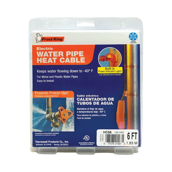 Built-in thermostat automatically helps keep your water pipes from freezing down to 38 degrees F below zero. Length is 6 foot. 120V. 7 watts per foot.