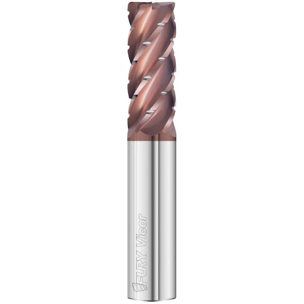 The 3505 Fury Vicor is a 4-flute, high performance end mill with chip breakers. The chip breakers allow reduced cutting forces and provides excellent chip control when machining stainless steels, super alloys, and titanium. It performs exceptionally in high-speed machining and full diameter milling as well as produces excellent surface finishes. The 3505 Fury Vicor is stocked with FC-20 coating.