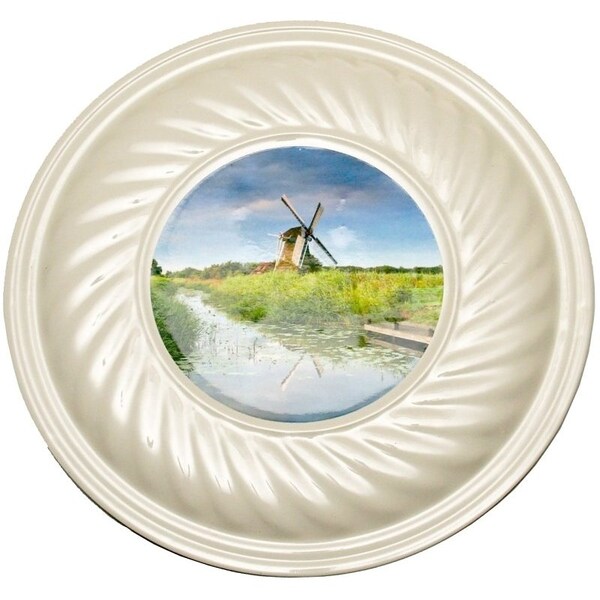 Embossed and decorated of first class material, enamel coated front and back. Clamps of spring wire constructed so they will never lose their strength. Springs will adjust themselves to fit either smooth or irregular flue hole. Colored finish.