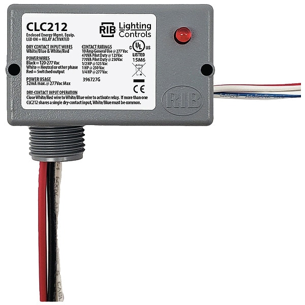 Enclosed Pre-Wired Relay, Contact Form SPST-NO, Current Rating 10 A, Mounting Style Surface, Nipple Size 0.50 in NPT, Contact Rating (AC) 10 A @ 277V, Input Voltage 120 to 277V AC, NEMA Enclosure Rating 1, Body Depth 1.5 in, Body Height 1.5 in, Body Width 1.7 in, For Use With Lighting, Frequency 50/60 Hz, Horsepower @ 120V AC 1/2 hp, Horsepower @ 240V AC 1 hp, Lead Length 16 in, Lead Size 18 AWG, Maximum Operating Temperature 140 Degrees F, Mechanical Operating Durability 10,000,000
