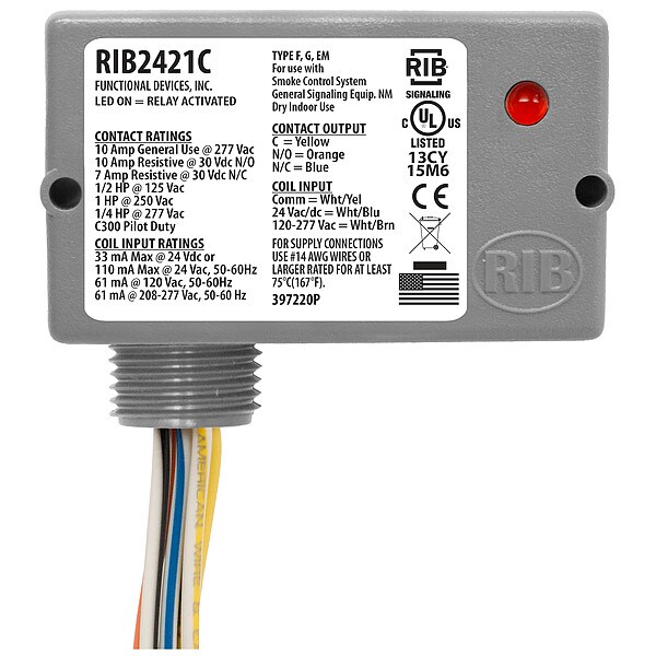 Enclosed Pre-Wired Relay, Contact Form SPDT, Current Rating 10 A, Mounting Style Surface, Nipple Size 0.50 in NPT, Contact Rating (AC) 10 A @ 277V, Contact Rating (DC) 10 A @ 30V, Input Voltage 120/208 to 277V AC/DC, 24V AC, NEMA Enclosure Rating 1, Body Depth 1.5 in, Body Height 2.8 in, Body Width 1.7 in, Contact Material Silver Alloy, For Use With Exhaust Fans, Motors, Vacuums, Frequency 50/60 Hz, Horsepower @ 120V AC 1/2 hp, Horsepower @ 240V AC 1 hp, Lead Length 16 in