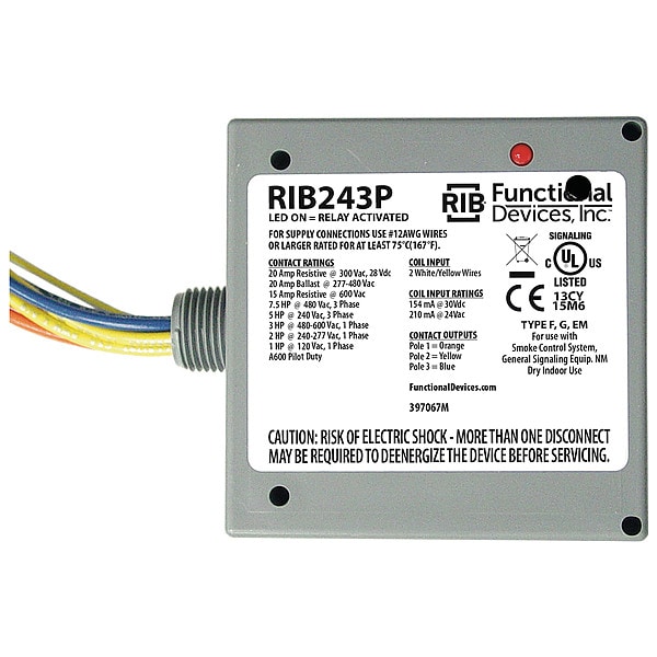 Enclosed Pre-Wired Relay, Contact Form 3PST-NO, Current Rating 20 A, Mounting Style Surface, Nipple Size 0.50 in NPT, Contact Rating (AC) 15 A @ 600V, 20 A @ 277 to 480/300V, Contact Rating (DC) 20 A @ 28V, Input Voltage 24V AC/DC, NEMA Enclosure Rating 1, Body Depth 1.8 in, Body Height 1.8 in, Body Width 4 in, Contact Material Silver Alloy, Electrical Phase Three, For Use With Exhaust Fans, Motors, Vacuums, Frequency 50/60 Hz, Horsepower @ 120V AC 1 hp, Horsepower @ 240V AC 2 hp