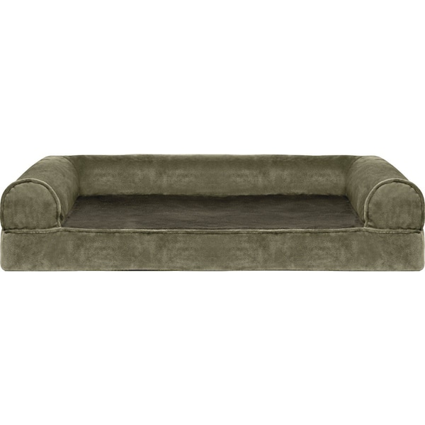 Medium faux fur and velvet orthopedic sofa style dog bed. Dark sage color.