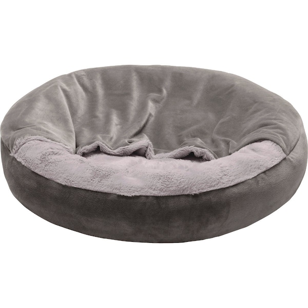 Small velvet and wave fur hooded donut dog bed. Dark gray color.