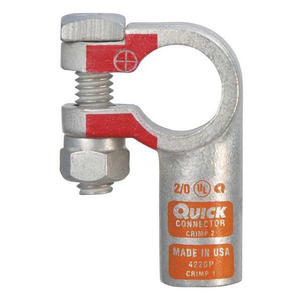 Battery Terminal, Alignment Left Elbow, Connection Type Crimp, Gauge 2/0 ga, Color Code Orange, Polarity Positive, Contact Material Copper, Tin, Overall Length 2 1/16 in, Overall Width 1.4 in, Overall Depth 0.7 in, Features Permanent, Readable Gauge and Polarity Stamped on Clamp, Tin Plated for Added Conductivity and Corrosion Resistance, Standards CUL, RoHS Compliant, UL, Includes Fasteners, Attachment Location Top, Stud Size 5/16 in