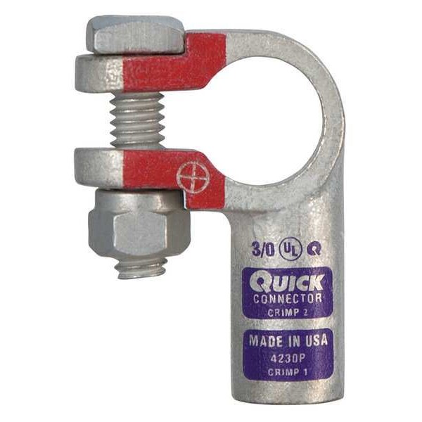 Battery Terminal, Alignment Left Elbow, Connection Type Crimp, Gauge 3/0 ga, Color Code Purple, Polarity Positive, Contact Material Copper, Tin, Overall Length 2 1/16 in, Overall Width 1.4 in, Overall Depth 0.7 in, Features Permanent, Readable Gauge and Polarity Stamped on Clamp, Tin Plated for Added Conductivity and Corrosion Resistance, Standards CUL, RoHS Compliant, UL, Includes Fasteners, Attachment Location Top, Stud Size 5/16 in