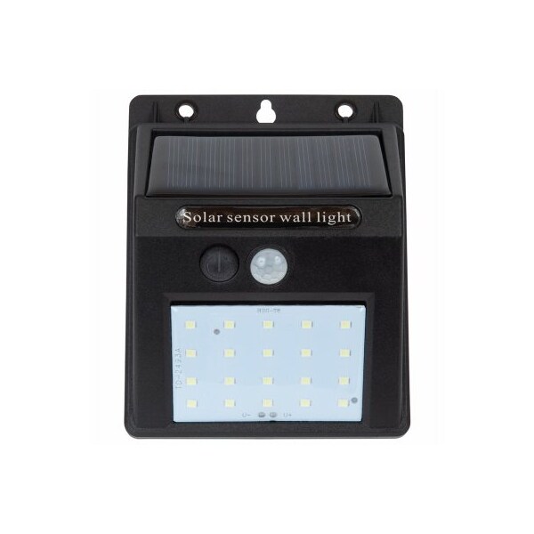Solar motion sensor wedge light features 20 bright white SMD surface mounted device LEDs light emitting diode Includes an amorphous solar panel and a rechargeable lithium battery Provides up to 80 lumens of light output and up to 8 hours of run time