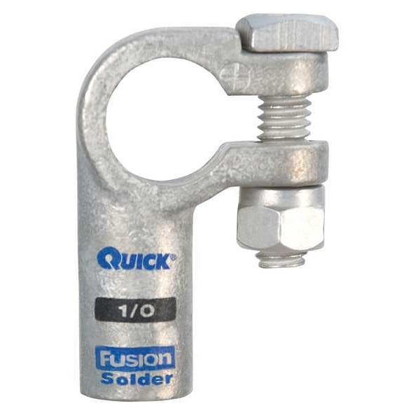 Battery Terminal, Alignment Right Elbow, Connection Type Solder, Gauge 1/0 ga, Color Code Black, Polarity Positive, Contact Material Copper, Tin, Overall Length 2 1/16 in, Overall Width 1.4 in, Overall Depth 0.7 in, Features Stronger than Crimp Method, Tin Plated for Added Conductivity and Corrosion Resistance, Standards RoHS Compliant, Includes Fasteners, Attachment Location Top, Stud Size 5/16 in