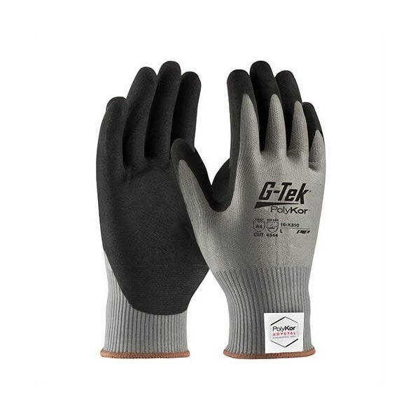 G-Tek cut resistant gloves series: 16-X310, large size, nitrile palm, micro surface nitrile coating, PolyKor Xrystal, black/gray, seamless style, Polykor/Xrystal lining, elastic/knit wrist cuff, 10.2 in L, resists: abrasion, chemical, cut, puncture, tear, UV and water.