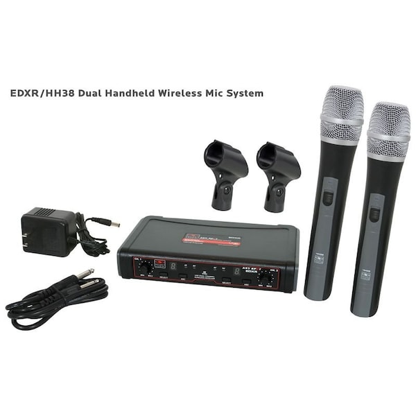TWO Galaxy Audio HH38 Dynamic Handheld Mic Transmitters with On Off Switch for the EDX Wireless Microphone System Dynamic Cardioid On/Off Switch IR Sync Transmitter to Receiver Plastic Casing Operates on 2 AA Batteries up to 8 hours Alkaline Dimensions: 10.9'' 1.85'' 277 x 47 mm LxDia Weight: 6.9 oz 195 ghe EDX Series is a professional dual channel UHF wireless microphone system. The EDX features 2 internal antennas 1 for each receiver, 16 selectable channels on each receiver, and IR Sync from receiver to transmitter. The EDX has 2 discreet male XLR outputs and 1 combined 1/4'' output on the back of the unit. The output is controlled by a volume control for each receiver, located on the front of the unit. up to 200 foot Range 16 Selectable UHF Frequencies Internal AntennasEDXR Receiver Dual Channel Receiver AF & RF Indicators IR Sync Receiver to Transmitters 1 Mixed 1/4'' Output, 2 Balanced Male XLR Outputs 2 Internal Antennas Non-Diversity Rugged Plastic Casing Available Channels 16 Frequency Range CODE D 584-607 MHz CODE N 518-542 MHz Transmitter Output Level 10 mW Band UHF Operating Range Under Typical Conditions 200 foot 61 m, actual range depends on RF signal absorption, reflection, and interference. Audio Frequency Response +/-3 dB 60 Hz 16 kHz Total Harmonic Distortion +/-30 kHz deviation 1 kHz tone: <1% Dynamic Range >90 dB A-weighted Operating Temperature Range 14 degrees F to 122 degrees F -10 degrees C to 50 degrees C, battery characteristics may limit this range.EDXR RECEIVER Audio Output Level XLR Connector into 600 Ohms load -12 dBV 1/4-in Connector into 3 k Ohms load -18 dBV Output Impedance XLR Connector 200 Ohms 1/4-in Connector 1 k Ohms Sensitivity -92 dBm Image Rejection >92 dB Dimensions 1.7-in x 8.3-in x 5-in 42 x 210 x 127 mm HxWxD Weight 13.6 oz 390 g Power Requirements 12-18 V dc at 300mA, supplied by external power supply HH38 HANDHELD TRANSMITTER Max Audio Input Level 0 dBV Gain Adjust Trim pot RF Output 10 mW Frequency Response 70 Hz - 10 kHz Dimensions 10.9-in x 1.85-in 277 x 47 mm LxDia. Weight 6.9 oz 195 g without batteries Power Requirements 2 AA-in size alkaline or rechargeable batteries Battery Life About 8 hours Alkaline