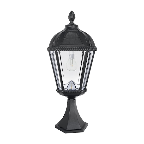 The Gama Sonic Royal Bulb is a single lamp head solar light for a pier mount application that features an attractive design inspired by New Orleans architecture. Installation takes minutes and comes with all the necessary hardware needed for mounting this unit. Stylish and easy to install, this fixture is the perfect energy and money saving replacement for electric or gas-powered outdoor lighting.The Royal Bulb is constructed of weather-resistant, rust resistant cast aluminum with a powder-coated black finish and beveled glass panes. This outdoor solar pier lamp incorporates our cutting-edge GS solar LED light bulb technology and provides 360-degree illumination. At dusk, the solar lamp automatically turns on at a brightness of 120 lumens in a warm white color temperature 2700K for up to 2 nigts on a full charge. No wiring is needed. Just place this solar light in a spot with ample direct sunshine and let the sun do the rest.