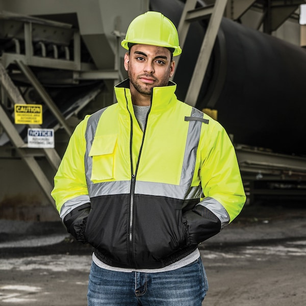 Men's Hi-Vis Bomber Jacket, 100% Polyester 300 Denier Oxford, Hi Vis Lime, L