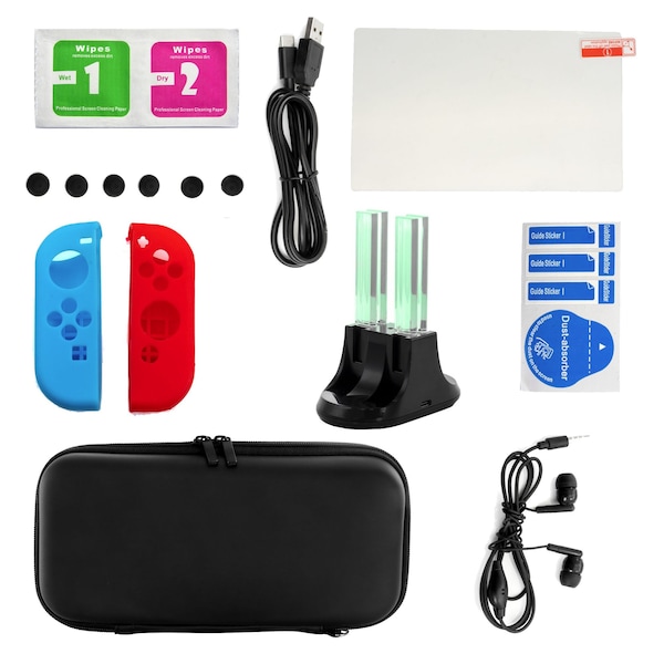 Level up your gaming gear with the GameFitz 14 in 1 Accessories Kit for Nintendo Switch! This accessories pack is designed to protect and allow you to use your game controllers and console comfortably. This set comes complete with a Dual Charging Dock for fast and easy charging, hard shell EVA Case for optimal protection, Joy-Con Silicone Sleeves(Red, Blue)for a more comfortable grip, Wired Earphones for simple connection, 6 Thumb Grips for better game play, Type C Cable for charging dock, Glass Screen Protector for added protection, Guide Stickers and Wipes for screen protector instillation. Case not only securely allows you to travel with your console, but allows you to travel and carry extra games and accessories in the provided pockets and spaces. Get your new kit for on the go! GameFitz 11 in 1 Accessories Kit for Nintendo Switch Lite is the ideal gaming accessory. Allowing you to level up your gaming gear and your overall gaming experience, this accessories pack is designed to protect and allow you to use your console comfortably. This set comes complete with a Charging dock for quick and easy charging, TPU Shell Case for easy of use, EVA Carry Case for safe travel, Wired Earphones for quick and easy connection, 4 Thumb Grips for comfort, Glass Screen Protector to protect your screen and Guide Sticker and Wipes to help install the the screen protector. Hard shell EVA Carry Case not only securely allows you to travel with your console, but allows you to travel with additional games and accessories in the additional provided pockets and spaces. Get your new kit for on the go!
