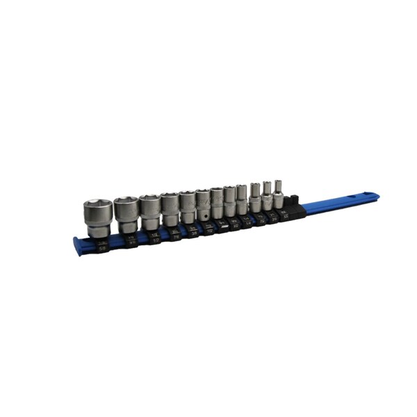 12 Piece Garant 1/4 inch Drive 6 Point Standard Socket Set including the following sizes: 5/32, 3/16, 7/32, 1/4, 9/32, 5/16, 11/32, 3/8, 7/16, 1/2, 9/16, 5/8Specifications:Forged from high quality steel.Internally beveled for easy fitting to bolt heads.Square socket drive with bore.Close tolerance jaw sizes with HT drive profile protects corners of nuts and bolt heads.Thin walls for access to restricted places.Material:Chrome vanadium steel, chrome-plated