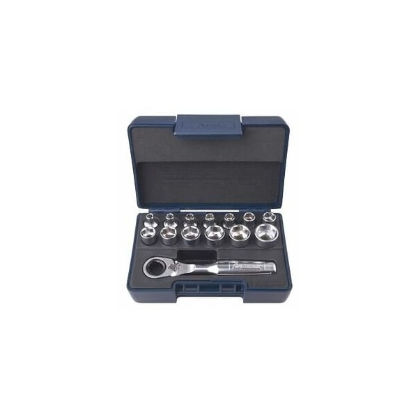 Drives / accessories to DIN 3122 / 3123, sockets to DIN 3124. Internal / external square drives to DIN 3120. All tools are held securely for easy access in a specially moulded hard-wearing PUR foam inlay. Advantage: Due to the low height, particularly suitable for use in restricted spaces. Up to 50% space saving compared to conventional products. Application: For external hexagon screws / nuts with thread M2 M8. Supplied with: Sockets single hexagon: 13 pcs. size 4, 4.5, 5, 5.5, 6, 7, 8, 9, 10, 11, 12, 13, 14 mm Ratchet: 1 pc. No. 630357 Storage in: ABS plastic box Height: 47 mm Square drive: 1/4 in Width across flats range, hexagon sockets: 4-14 mm
