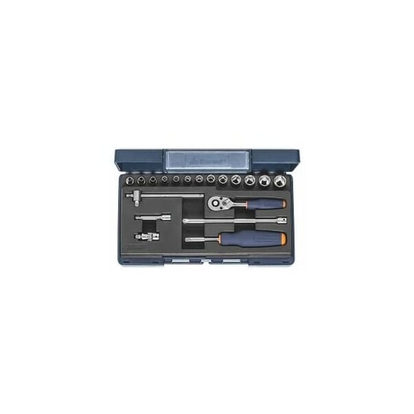 Drives / accessories to DIN 3122 / 3123, sockets to DIN 3124. Internal / external square drives to DIN 3120. All tools are held securely for easy access in a specially moulded hard-wearing PUR foam inlay. Application: For external hexagon screws / nuts with thread M2 M8. Material: Chrome vanadium steel, chrome-plated. Supplied with: Sockets single hexagon: 13 pcs. No. 631029 size 3.5, 4, 4.5, 5, 5.5, 6, 7, 8, 9, 10, 11, 12, 13 T-handle: 1 pc. No. 633029 size 116 Spinner handle: 1 pc. No. 632829 size 146 Extensions: 2 pcs. No. 632429 size 50, 150 Universal joint: 1 pc. No. 633529 size 1/4 Ratchet: 1 pc. No. 632025 size 1/4 Storage in: ABS plastic box Degree of fill of a drawer in units: 5x10 Height: 45 mm Square drive: 1/4 in Width across flats range, hexagon sockets: 3.5-13 mm
