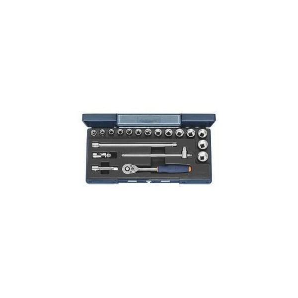 Drives / accessories to DIN 3122 / 3123, sockets to DIN 3124. Internal / external square drives to DIN 3120. All tools are held securely for easy access in a specially moulded hard-wearing PUR foam inlay. With hexagon sockets No. 637229. Application: For hexagon head screws / nuts with thread M5 M14. Material: Chrome vanadium steel, chrome-plated. Supplied with: Sockets: 14 pcs. size 8, 9, 10, 11, 12, 13, 14, 15, 16, 17, 18, 19, 21, 22 mm T-handle: 1 pc. No. 635729 Extensions: 2 pcs. No. 635429 size 75, 240 Universal joint: 1 pc. No. 636229 Ratchet: 1 pc. No. 635025 Storage in: ABS plastic box Degree of fill of a drawer in units: 6x14 Height: 45 mm Square drive: 3/8 in Width across flats range, hexagon sockets: 8-22 mm