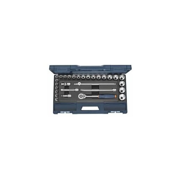 Drives / accessories to DIN 3122 / 3123, sockets to DIN 3124. Internal / external square drives to DIN 3120. All tools are held securely for easy access in a specially moulded hard-wearing PUR foam inlay. With hexagon sockets No. 642229. Application: For hexagon head screws / nuts with thread M6 M22. Material: Chrome vanadium steel, chrome-plated. Supplied with: Hexagon socket: 23 pcs. size 8, 9, 10, 11, 12, 13, 14, 15, 16, 17, 18, 19, 20, 21, 22, 23, 24, 26, 27, 28, 30, 32, 34 mm T-handle: 1 pc. No. 641329 size 295 Extensions: 3 pcs. No. 641029 size 75, 125, 250 1 each hexagon socket: 1 pc. No. 641629 size 1/2 Ratchet: 1 pc. No. 640025 size 1/2 Presented in: ABS plastic box Note: The range offers in addition space for 4 pieces of small parts storage bins No. 951251 size 2x3/1 or 2 pieces of small parts storage bins No. 951251 size 2x6/1 not included in the scope of supply. Degree of fill of a drawer in units: 8x20 Height: 61 mm Square drive: 1/2 in Width across flats range, hexagon sockets: 8-34 mm