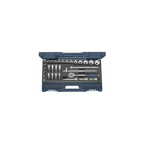 Drives / accessories to DIN 3122 / 3123, sockets to DIN 3124. Internal / external square drives to DIN 3120. All tools are held securely for easy access in a specially moulded hard-wearing PUR foam inlay. With hexagon sockets No. 642229. Application: For hexagon head screws / nuts with thread M6 M22 and hexagon socket head screws with thread M5 M18. Material: Chrome vanadium steel, chrome-plated. Supplied with: Hexagon socket: 18 pcs. size 8, 10, 11, 12, 13, 14, 15, 16, 17, 18, 19, 21, 22, 24, 27, 30, 32, 34 mm Hexagon screwdriver bits: 8 pcs. No. 643229 size 4, 5, 6, 7, 8, 10, 12, 14 T-handle: 1 pc. 641329 size 295 Extensions: 3 pcs. No. 641029 size 75, 125, 250 1 each hexagon socket: 1 pc. No. 641629 size 1/2 Ratchet: 1 pc. No. 640025 size 1/2 Presented in: ABS plastic box Note: The range offers in addition space for 4 pieces of small parts storage bins No. 951251 size 2x3/1 or 2 pieces of small parts storage bins No. 951251 size 2x6/1 not included in the scope of supply. Degree of fill of a drawer in units: 8x20 Height: 61 mm Square drive: 1/2 in Width across flats range, hexagon sockets: 8-34 mm Width across flats range, hexagon wrenches: 4-14 mm