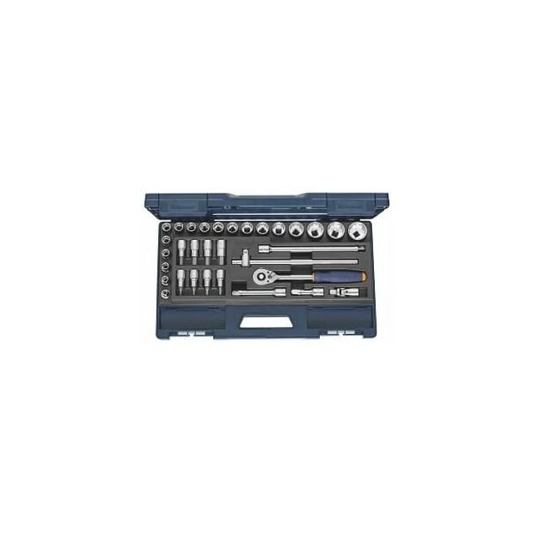 Drives / accessories to DIN 3122 / 3123, sockets to DIN 3124. Internal / external square drives to DIN 3120. All tools are held securely for easy access in a specially moulded hard-wearing PUR foam inlay. With bi-hexagon sockets No. 642129. Application: For hexagon head screws / nuts with thread M6 M22 and hexagon socket head screws with thread M5 M18. Material: Chrome vanadium steel, chrome-plated. Supplied with: Hexagon socket: 18 pcs. size 8, 10, 11, 12, 13, 14, 15, 16, 17, 18, 19, 21, 22, 24, 27, 30, 32, 34 mm Hexagon screwdriver bits: 8 pcs. No. 643229 size 4, 5, 6, 7, 8, 10, 12, 14 T-handle: 1 pc. 641329 size 295 Extensions: 3 pcs. No. 641029 size 75, 125, 250 1 each hexagon socket: 1 pc. No. 641629 size 1/2 Ratchet: 1 pc. No. 640025 size 1/2 Presented in: ABS plastic box Note: The range offers in addition space for 4 pieces of small parts storage bins No. 951251 size 2x3/1 or 2 pieces of small parts storage bins No. 951251 size 2x6/1 not included in the scope of supply. Degree of fill of a drawer in units: 8x20 Height: 61 mm Square drive: 1/2 in Width across flats range, bi-hex sockets: 8-34 mm Width across flats range, hexagon wrenches: 4-14 mm