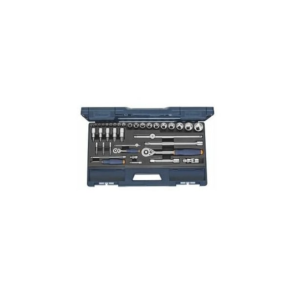 Drives / accessories to DIN 3122 / 3123, sockets to DIN 3124. Internal / external square drives to DIN 3120. All tools are held securely for easy access in a specially moulded hard-wearing PUR foam inlay. Application: For external hexagon screws / nuts with thread M2 M20. For hexagon socket head screws with thread M4 M18. Material: Chrome vanadium steel, chrome-plated. Supplied with: 1/4 inch hexagon socket set: 9 pcs. No. 631029 size 4, 5, 5.5, 6, 7, 8, 9, 10, 11 1/2 inch hexagon socket set: 10 pcs. No. 642229 size 13, 16, 17, 18, 19, 21, 22, 24, 27, 30 1/4 inch hexagon screwdriver bits: 3 pcs. No. 631729 size 3, 4, 5 1/2 inch hexagon screwdriver bits: 5 pcs. No. 643229 size 6, 8, 10, 12, 14 1/4 inch tommy-bar: 1 pc. No. 633029 size 116 1/2 inch tommy-bar: 1 pc. No. 641329 size 295 1/4 inch spinner handle: 1 pc. No. 632829 size 1/4 1/4 inch extensions: 2 pcs. No. 632429 size 50, 150 1/2 inch extensions: 2 pcs. No. 641029 size 130, 255 1/4 inch universal joint: 1 pc. No. 633529 size 1/4 1/2 inch universal joint: 1 pc. No. 641629 size 1/2 1/4 inch ratchet: 1 pc. No. 632025 size 1/4 1/2 inch ratchet: 1 pc. No. 640025 size 1/2 Storage in: ABS plastic box Note: The range offers in addition space for 4 pieces of small parts storage bins No. 951251 size 2x3/1 not included in the scope of supply. Degree of fill of a drawer in units: 8x20 Height: 61 mm Square drive: 1/2 in Square drive: 1/4 in Width across flats range, hexagon sockets: 4-30 mm Width across flats range, hexagon wrenches: 3-14 mm