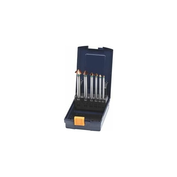 Handy for assembly and workshop use. High-precision countersink No. 150377, with long shank. Application: High-precision countersinks for chatter-free production of precise, round 90 Deg countersunk surfaces. Content: 1 pc. each countersink: Size 6.3, 8.3, 10.4, 12.4, 16.5, 20.5 Supplied with: 6-piece countersink set in a case. Shank: Parallel shank to h9 Number of cutting edges Z: 3