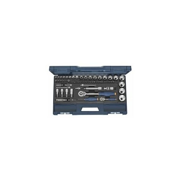 The Surface Drive profile works directly on the faces of the nuts and bolts, weaker corners are protected. Even intermediate sizes e.g. inch size bolts and worn bolt heads can be tightened or released using the Surface Drive profile. The Wobble-Fix extensions allow use at an angle and can be secured by clicking into place. Drives / accessories to DIN 3122 / 3123, sockets to DIN 3124. Internal / external square drives to DIN 3120. All tools are held securely for easy access in a specially moulded hard-wearing PUR foam inlay. Application: For external hexagon screws / nuts with thread M4 M20 and for hexagon socket head screws with thread M4 M18. For Pozidriv and Phillips screws with threads M2 M6, slot-head screws with thread M2.5 M5, for internal Torx screws with thread M3 M8 and for Trisquare screws with thread M4 M8. Material: Chrome vanadium steel, chrome-plated. Supplied with: 1/4 inch hexagon sockets, SurfaceDrive: 13 pcs. No. 631225 size 4, 4.5, 5, 5.5, 6, 7, 8, 9, 10, 11, 12, 13, 14 1/2 inch hexagon sockets, Surface Drive: 12 pcs. No. 642325 size 15, 16, 17, 18, 19, 21, 22, 24, 27, 30, 32, 34 1/2 inch hexagon screwdriver bits: 4 pcs. No. 643229 size 6, 8, 10, 14 1/4 inch hexagon BITS C 6.3: 4 pcs. similar to No. 675240 size 3, 4, 5, 6 1/4 inch BITS for Phillips C 6.3: 3 pcs. similar to No. 675310 size 1/25, 2/25, 3/25 1/4 inch Pozidriv BITS C 6.3: 3 pcs. similar to No. 675320 size 1/25, 2/25, 3/25 1/4 inch slot-head BITS C 6.3: 3 pcs. similar to No. 675250 size 3.5x0.6, 5.5x0.8, 8x1.2 1/4 inch BITS for Torx C 6.3: 6 pcs. similar to No. 675340 size TX10, TX15, TX20, TX25, TX30, TX40 1/4 inch tri-square BITS C 6.3: 4 pcs. similar to No. 675565 size M4, M5, M6, M8 1/4 inch tommy-bar: 1 pc. No. 633029 size 116 1/4 inch spinner handle: 1 pc. No. 632829 size 1/4 1/4 inch Wobble-Fix extensions: 2 pcs. No. 632519 size 50, 100 1/2 inch extensions Wobble-Fix: 1 pc. No. 641129 size 125 1/4 inch universal joint: 1 pc. No. 633529 size 1/4 1/2 inch universal joint: 1 pc. No. 641629 size 1/2 1/4 inch ratchet: 1 pc. No. 632025 size 1/4 with ejector 1/2 inch ratchet: 1 pc. No. 640025 size 1/2 with ejector 1/4 inch adapter E 6.3: 1 pc. similar to No. 675020 6.3K for 1/4 inch BITS C 6.3 1/4 inch converter: 1 pc. similar to No. 650005 size 2 hexagon coupling 1/4 inch E 6.3 external square 1/4 inch 1/2 inch converter: 1 pc. similar to No. 650005 size 5 hexagon coupling 7/16 inch E 11.2 external square 1/2 inch 1/4 inch bit adapter: 1 pc...