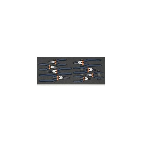 Popular tool sets in two-color moulded PE rigid foam inlays. The closed-pore foam is oil-resistant and does not absorb liquids of any sort. Upper layer anthracite, under which the contrast color of blue indicates if a tool is missing. The rigid foam inlays fill 1/4 10 G x 8 G or 250 x 200 mm or 1/2 20 G x 8 G or 500 x 200 mm of the usable drawer area. Suitable for: New GARANT roller cabinets with full extension drawers and a new drawer module of 20 G x 16 G or 500 x 400 mm W x D. Supplied with: Rigid foam inlay, empty No. 952001 size 954217: 1 pc. GARANT precision circlip pliers No. 719770 size J0, J1, J2, J3, J01, J11, J21, J31: 1 pc. each Degree of fill of a drawer in units: 8x20 Width: 200 mm Depth: 500 mm Width in G: 8 Depth in G: 20
