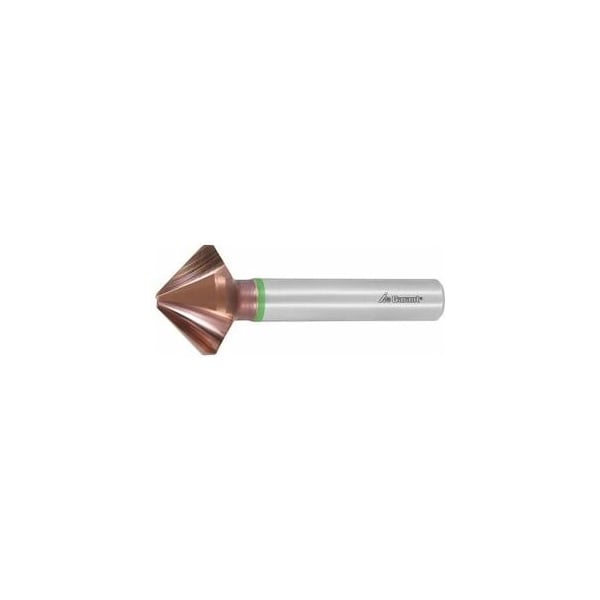 All countersinks have 3 cutting edges. Special geometry with extremely unequal spacing and matching cutting edge preparation. Radially relief ground. Flutes ground from solid. Newly developed special TiAlN coating for long service life. High-precision countersink, produced with tight manufacturing tolerances similar to DIN 335-C. Advantage: Very smooth cutting throughout the entire countersinking operation. Chatter-free running for perfect results and optimum tool service life. Application: High-precision countersinks for production of exactly round 90 Deg countersunk surfaces. Through-coolant: no Number of cutting edges Z: 3 Number of cutting edges Z: 3 smallest countersink Dia. for holes from: 1.5 mm Overall length L: 45 mm Shank Dia. Ds: 5 mm for countersunk screws ISO 2009, 2010, 7046, 7047: M3 Feed f in steel < 500 N/mm2: 0.1 mm/rev.