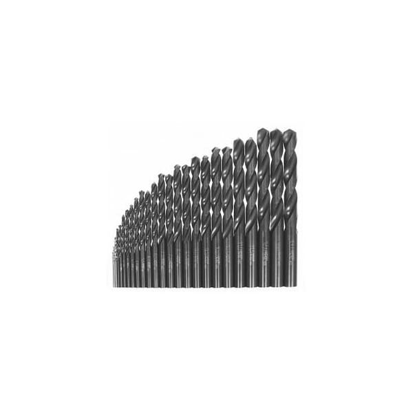 Composed of jobber drills DIN 338. Profile ground: Jobber drill with high pitch accuracy and concentricity as well as precision ground point. Steam tempered from Dia. 2.4 mm. With point geometry shape C from size 4 mm Through-coolant: no Shank: Plain shank Number of cutting edges Z: 2 Drill range: 1 13 mm Number of drills: 25 Incremental steps of drills: 0.5 mm