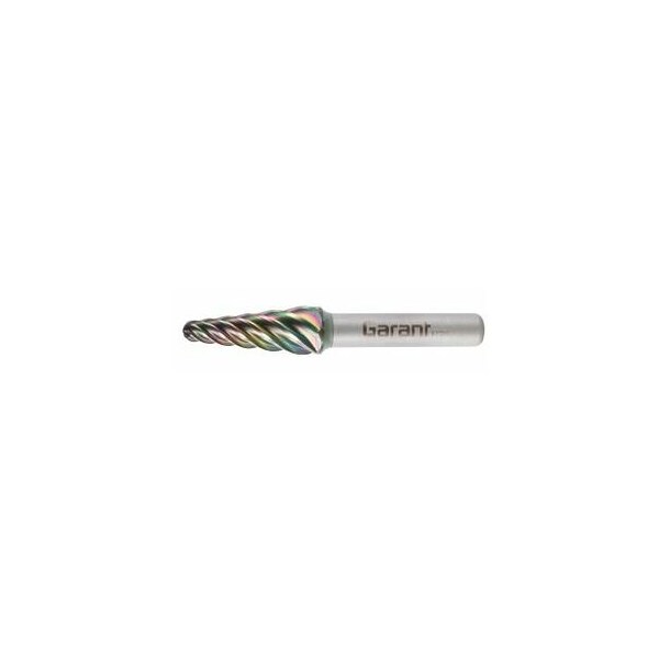 No chip adhesion and outstanding surface results. Shank 6mm. Suitable for use in roughing and finishing applications. With high-performance coating for longer tool life, less heat input and reduced chip adhesion. High rate of material removal. Smooth running. High-performance coating for low thermal stress, longer tool life, and improved chip evacuation. State-of-the-art substrate optimized for aluminium materials. Maximum tool life. GARANT burrs are manufactured from the highest quality carbide with high wear resistance and maximum cutting edge strength, using only the latest CNC machines. Steel shanks are used when the head diameter is larger than the shank diameter, otherwise they are made from solid carbide. The innovative tooth geometry permits a high metal removal rate and at the same time extremely smooth running and very good guidance. Extra-sturdy shank with 8 mm. Application: For the most demanding burring operations. optimized for machining hard and soft aluminium alloys, plastics, bronze and non-ferrous metals. Suitable for both manual use and industrial robots. For deburring, edge breaking, cleaning, weld and surface preparation. Note: Materials with poor thermal conductivity: Reduce speed in order to avoid overheating the burr and smearing. Shank : 8 mm Shape description: Round cone Head : 12 mm Head length: 30 mm Overall length: 70 mm Shank : 8 mm