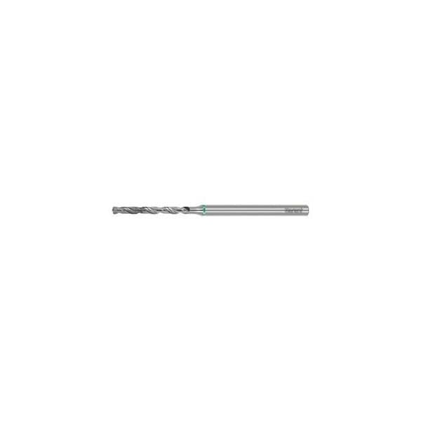 High-performance micro-drill for universal material use, focusing on steel processing. Maximum process reliability due to exactly matched tools within the overall system and expanded guide chamfer. Drilling of very small diameters down to the maximum depth after creating a pilot hole. Optimum compromise between core diameter and flute size for optimum chip evacuation - even with long-chipping materials. The increased metal removal rates and longer tool life ensure an economical drilling process, even with very small hole diameters combined with a large L/D ratio. Note: For reliable use of the micro-drills from 8xD, a pilot hole of at least 4xD is required using the micro-pilot drill 121223. For vertical machining and flat workpiece surfaces, a pilot hole can be dispensed with from DC = Dia. 1 mm up to a length of 12xD. Please always ensure that the pilot hole is free from chips before using the subsequent drilling tool. We recommend setting a 90 Deg counterbore with a suitable NC spotting drill after the pilot hole has been completed. For critical applications e.g. highest possible production accuracy, minimal burr formation, reduced coolant pressure, reduce the feed rate of the tool by 50% before entering and exiting the material. Long-chipping materials may require chips to be evacuated in steps of 3xD each by moving the drill back slightly at pilot hole depth. Please make sure that you use a suitable tool clamping device shrink-fit chuck, hydraulic clamping chuck with a radial run-out of less than 0.003 mm, a sufficiently high coolant pressure at least 30 bar, as well as sufficiently fine filtration of the cooling medium DC