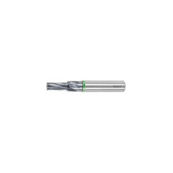Solid carbide thread milling cutters with irregular cutting edge spacing and an increased number of cutting edges. Due to the irregular cutting edge spacing they achieve very smooth running and long tool life. Newly developed universal geometry and high-performance coating for use across a wide spectrum of materials. Significantly reduced vibration due to irregular cutting edge spacing. Increased number of cutting edges. The latest generation of AlTiN-based HiPIMS coating. Corrected thread profile for avoidance of profile distortions. Advantage: Incorporating a countersink profile for a 90 Deg countersink and thread milling in a single operation. Through-coolant: yes No. of teeth Z: 4 Thread pitch: 1 mm Nominal Dia. DC: 6.6 mm Flute length Lc: 16.5 mm Shank length Ls: 40 mm Overall length L: 75 mm Shank Dia. Ds: 10 mm