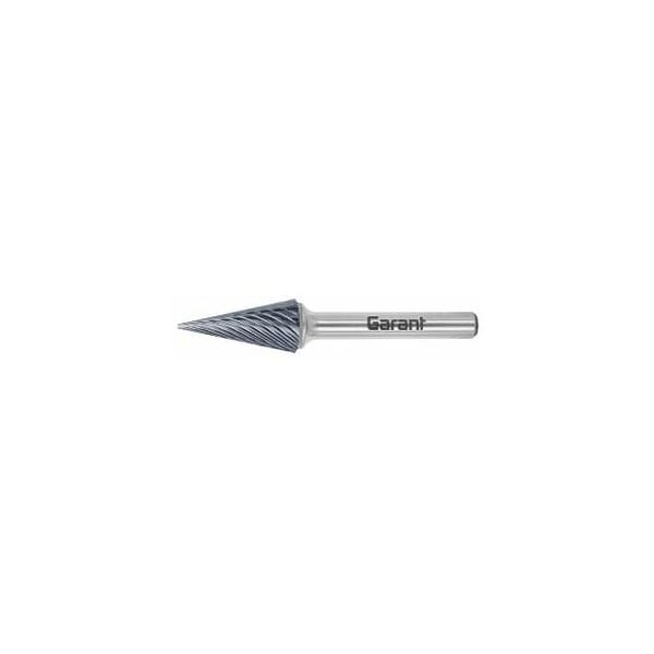 The newly developed innovative tooth geometry permits a high metal removal rate and at the same time extremely smooth running and very good guidance. The optimum chip formation no pointed chips achieves high surface quality in roughing and finishing applications. High rate of material removal. Smooth running. Low thermal stress, long tool life, improved chip evacuation. For general-purpose use on steel, stainless steel, aluminium. Shank 6 mm. GARANT burrs are manufactured from high performance carbide grades with high wear-resistance and maximum cutting edge strength, using only the latest CNC machines. Steel shanks are used when the head diameter is larger than the shank diameter, otherwise they are made from solid carbide. Additional TiAlN coating for longer working life and temperature resistance. For high thermal and mechanical loadings Heavy Duty. Longer tool life. Less heat input. Better chip evacuation. Application: Suitable for use with power tools and industrial robots, on almost all materials. For deburring, edge breaking, cleaning, weld and surface preparation. Note: Materials with poor heat conductivity: Reduce speed in order to avoid overheating the burr and smearing. Shank : 6 mm Shape description: pointed cone Head : 6 mm Head length: 18 mm Overall length: 50 mm Shank : 6 mm