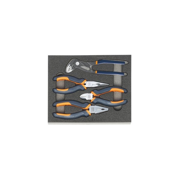 Pliers set in Heavy Duty Foam, 4 Pc. Version: Popular tool sets in two-color molded PE rigid foam inlays. The closed-pore foam is oil-resistant and does not absorb liquids of any sort. Upper layer is anthracite- the underlying contrast color is grey- thereby indicating any missing tools. Supplied with: Rigid foam inlay- empty No. 952001 size 954171: 1 pc. GARANT combination pliers No. 700940 size 160: 1 pc. GARANT water pump pliers No. 706001 size 180: 1 pc. GARANT snipe-nose pliers No. 713040 size 160: 1 pc. GARANT side cutter No. 724840 size 140: 1 pc. Degree of fill of a drawer in units: 8x10 Width: 200 mm Depth: 250 mm Width in G: 8 Depth in G: 10