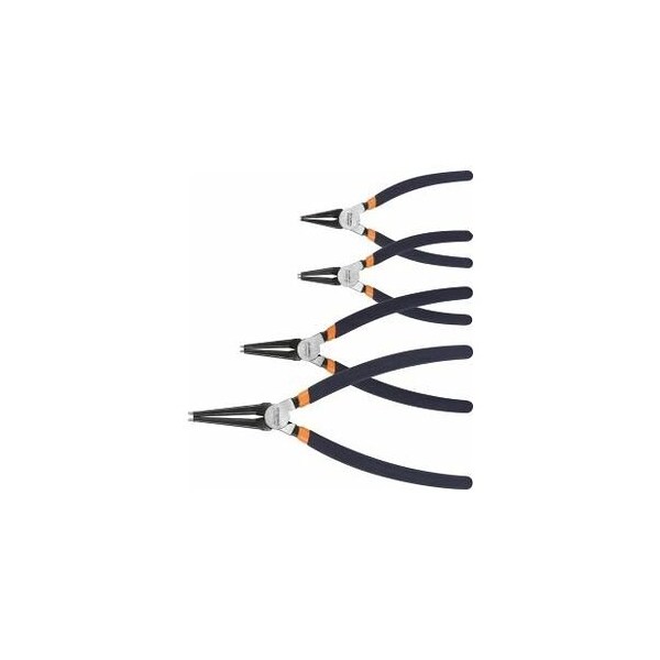 Forged grip and joint, precision made tips of special steel, special precision profile, pressed into the body. Pliers black, head ground, plastic coated handles. Joint with integral opening spring. Advantage: Pressed-in tips are highly durable even during continuous operation. Up to 10 times the working life of turned tips. Standard: DIN 5254 A fr Auensicherungsringe. Supplied with: 1 each circlip pliers No. 719870 size A0, A1, A2, A3. Use of circlip pliers: Outer ring, straight for external circlip : 3 10, 10 25, 19 60, 40 100 mm Tip : 0.9, 1.25, 1.8, 2.25 mm maximum overall length: 140, 140, 185, 230, mm