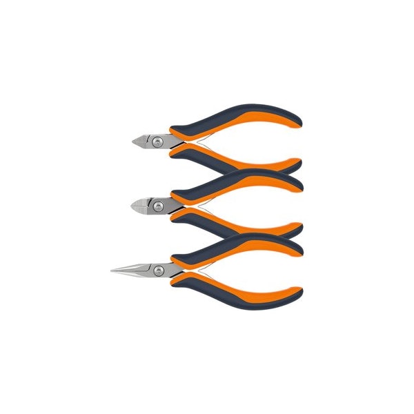 Precision machined with slim shape. Cutter induction hardened 62-64 HRC- jaws with smooth gripping faces. Non-reflecting surface- matt shot-blasted with inlaid joint and countersunk screw. Double interchangeable spring for easy operation. 2-component grips made of conductive plastic. Suitable for ESDs. Cutting edges precision ground. Material: CNC-machined special tool steel for extremely accurate tolerances. Supplied with: 1 electronics side cutter No. 726250 pointed head: Size 125 1 electronics side cutter No. 726210 normal head: Size 125 1 electronics snipe-nose pliers No. 727170: Size 140 Stored in: ABS plastic box Cutting chamfer: fine bevel