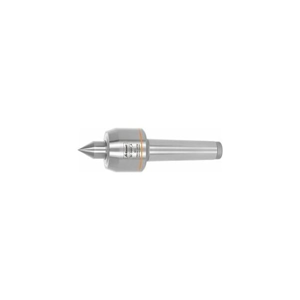 Punch axis of through-hardened steel mounted on shank bearings. Live Center through hardened, multiple regrinding possible. Precision roller bearings for high concentricity. Maintenance-free due to lifetime lubrication. Special seal prevents ingress of dirt and coolant. Complete tool hardened and ground. Point angle 60 Deg. Description: Lathe Centers are mainly used on lathes to support long and slim workpieces, since with these workpieces there would otherwise be a risk of the workpiece bending or moving around as a result of the forces generated. The lathe Center is secured with a Morse taper. The workpiece is clamped in the chuck and a counterbore is added using a Center drill. After re-clamping, the lathe Center is then inserted. Application: For all types of lathe, equally suitable for roughing and finish turning. Body Dia D: 45 mm Reach B: 76 mm largest Center point Dia 60 Deg A: 20 mm maximum radial run-out: 0.005 mm Center point length C: 26 mm maximum speed: 5000 min-1
