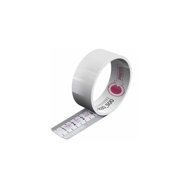 Stainless steel tape with wear-resistant stove-enamelled markings. Advantage: The convex camber allows the tape to lie flat on the desk, so that dimensions can be read and transferred easily and without errors. Function: Retracts easily at the push of a finger.